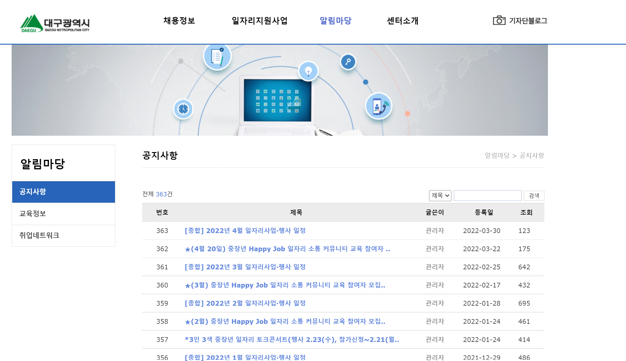 "알림마당" 메뉴에서는 달마다 올라오는 공지 사항과 교육 정보, 취업 네트워크 등을 확인하여 서비스를 지원받을 수 있습니다.