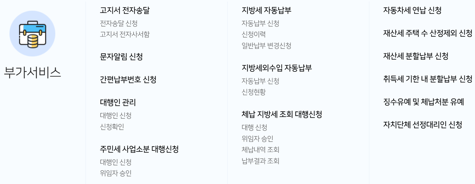 부가서비스에서는 고지서 전자송달, 문자알림 신청, 간편납부번호 신청, 대행인 관리, 주민세 사업소분대행신청, 지방세 자동납부 등의 부가서비스 납부 신청을 할 수 있습니다.