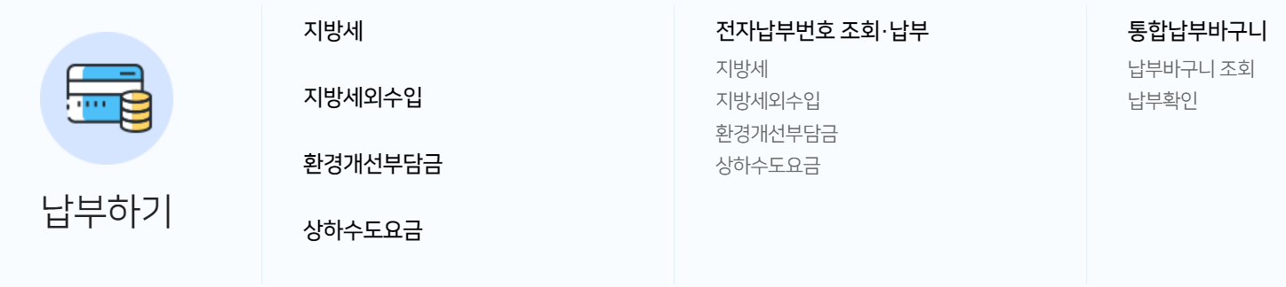 납부하기에서는 지방세, 지방세외수입, 환경개선부담금, 상하수도요금, 전자납부번호 조회/납부, 통합납부바구니 등의 서비스를 이용 할 수 있습니다.