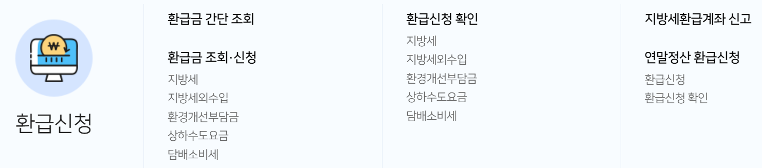 환급신청에서는 환급금 간단 조회, 환급금 조회/신청, 환급신청 확인, 지방세환급계좌 신고, 연말정산 환급신청 서비스를 이용 할 수 있습니다.