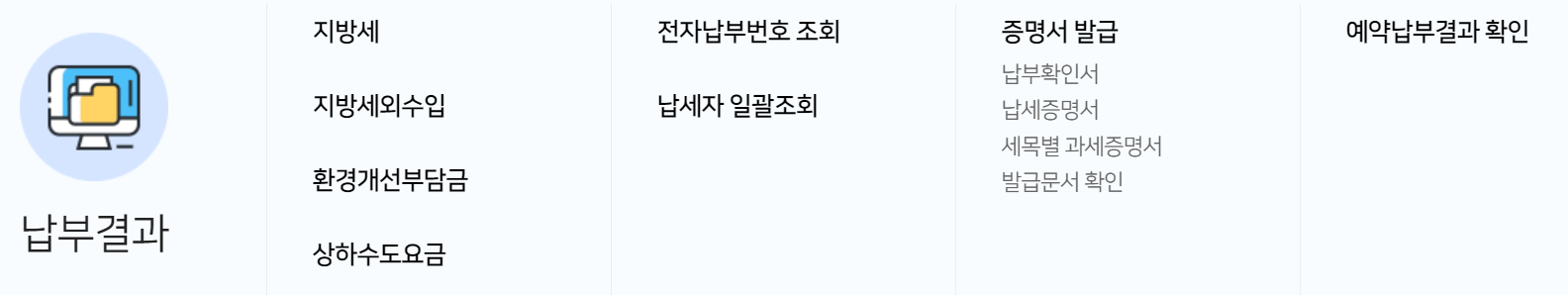 납부결과에서는 지방세, 지방세외수입, 환경개선부담금, 상하수도요금, 전자납부번호조회, 납세자 일괄조회, 증명서발급, 예약납부결과 확인을 할 수 있습니다.