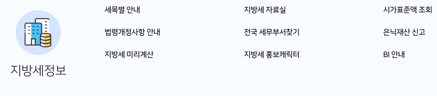 지방세정보에서는 세목별 안내, 법령개정사항 안내, 지방세 미리계산, 지방세 자료실, 전국 세무부서찾기, 지방세 홍보캐릭터, 시가표준액 조회 등의 정보들을 확인 할 수 있습니다.
