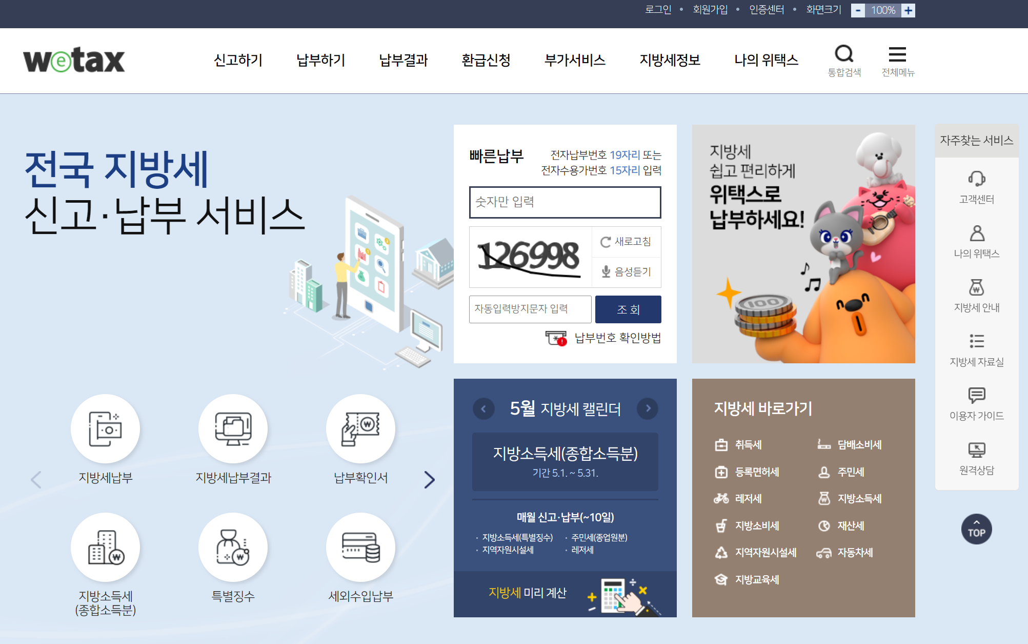 위택스 홈페이지에서는 지방세, 취득세, 주민세 등등 각종 신고, 납부, 환급신청이 가능합니다.