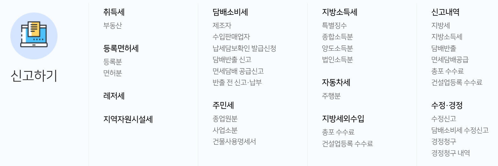 신고하기에서는 취득세, 등록 면허세, 레저세, 지역자원시설세, 담배소비세, 주민세, 지방소득세, 자동차세, 지방세외수입, 신고내역, 수정/경정 등을 할 수 있습니다.