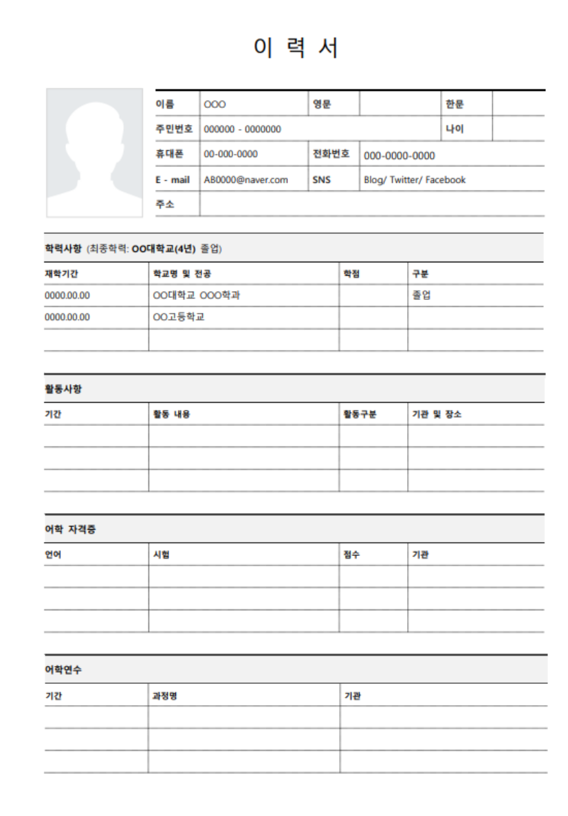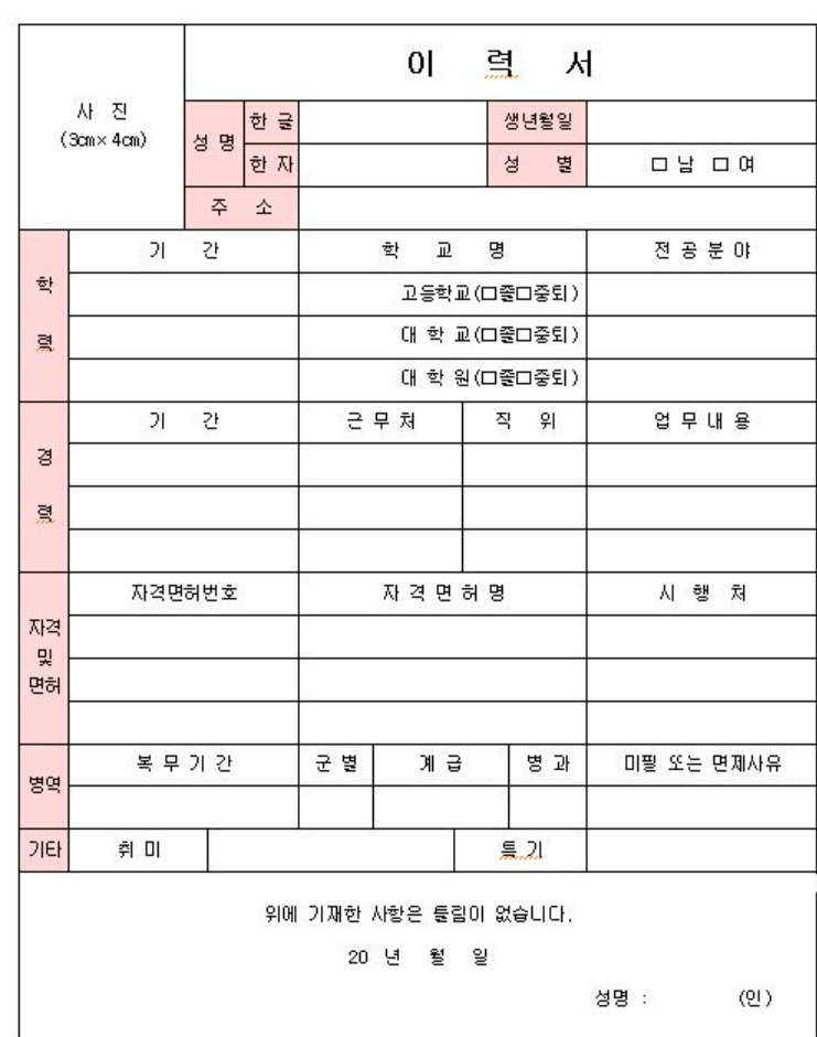 그렇지만 표로 된 이력서라도 필요 없는 항목이 많다면 수정이 필요한 상황이 생길 수 있는데 다운을 받아서 내가 필요한 만큼 수정하여 사용하면 될 것 같습니다.