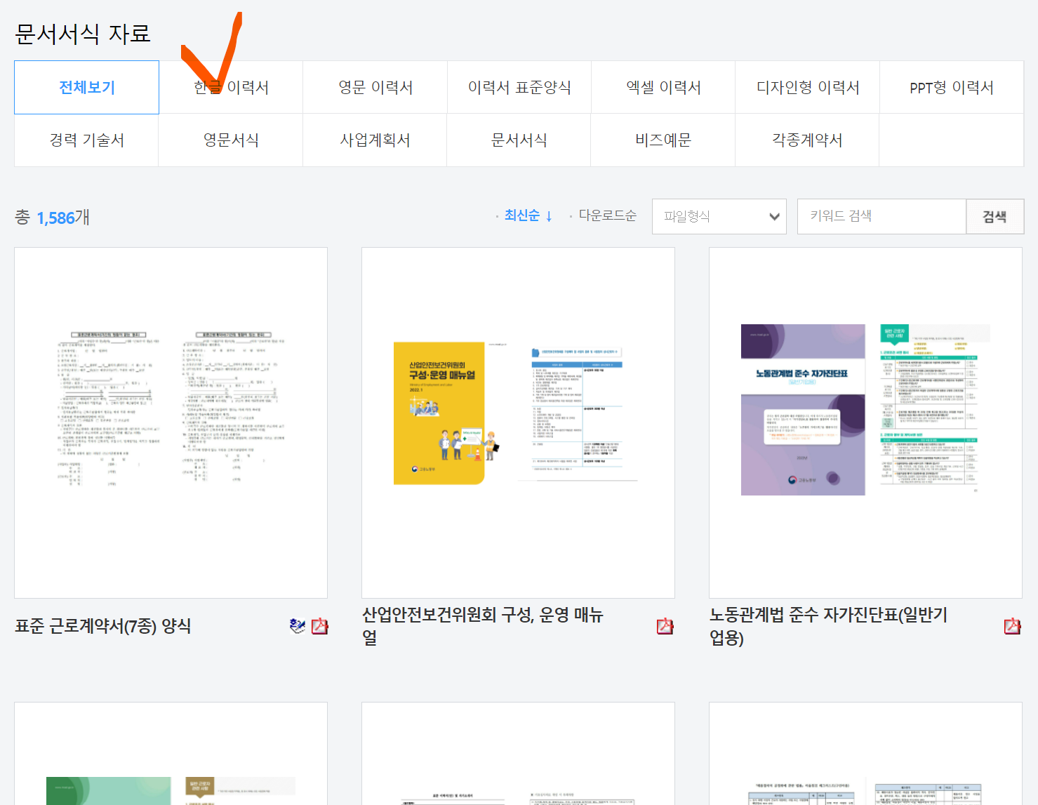 4. 문서서식 자료를 누르면 아래와 같이 서식 자료들이 나옵니다. 여기서 "한글 이력서"를 클릭해 우리에게 필요한 이력서들을 다운 받을 수 있습니다.