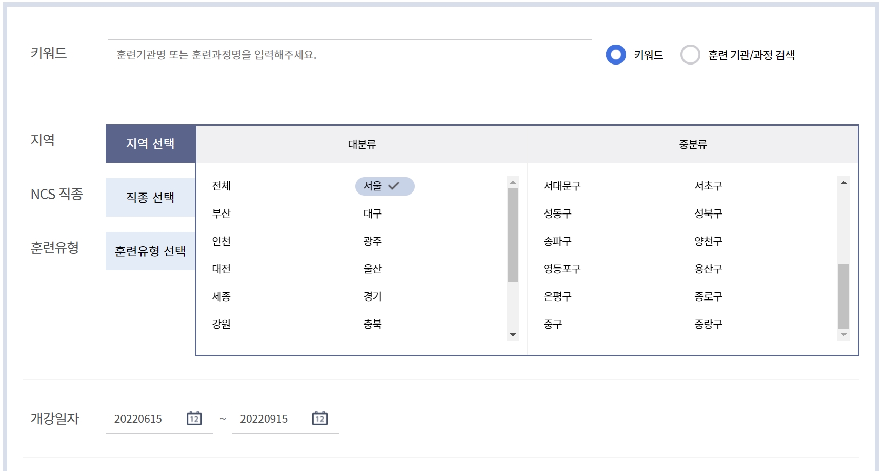 훈련과정에 들어가면 지역, 직종을 선택하여 나에게 맞는 정보를 확인 할 수 있습니다.