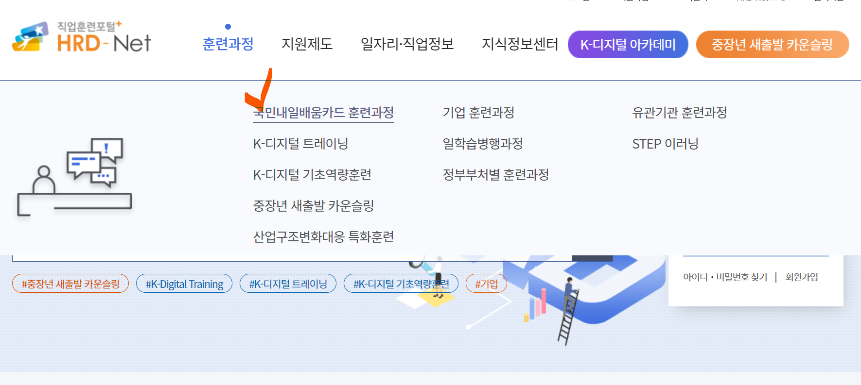 홈페이지에 들어가면 홈페이지 메인 메뉴에 "훈련과정"이라는 메뉴를 볼 수 있습니다.
