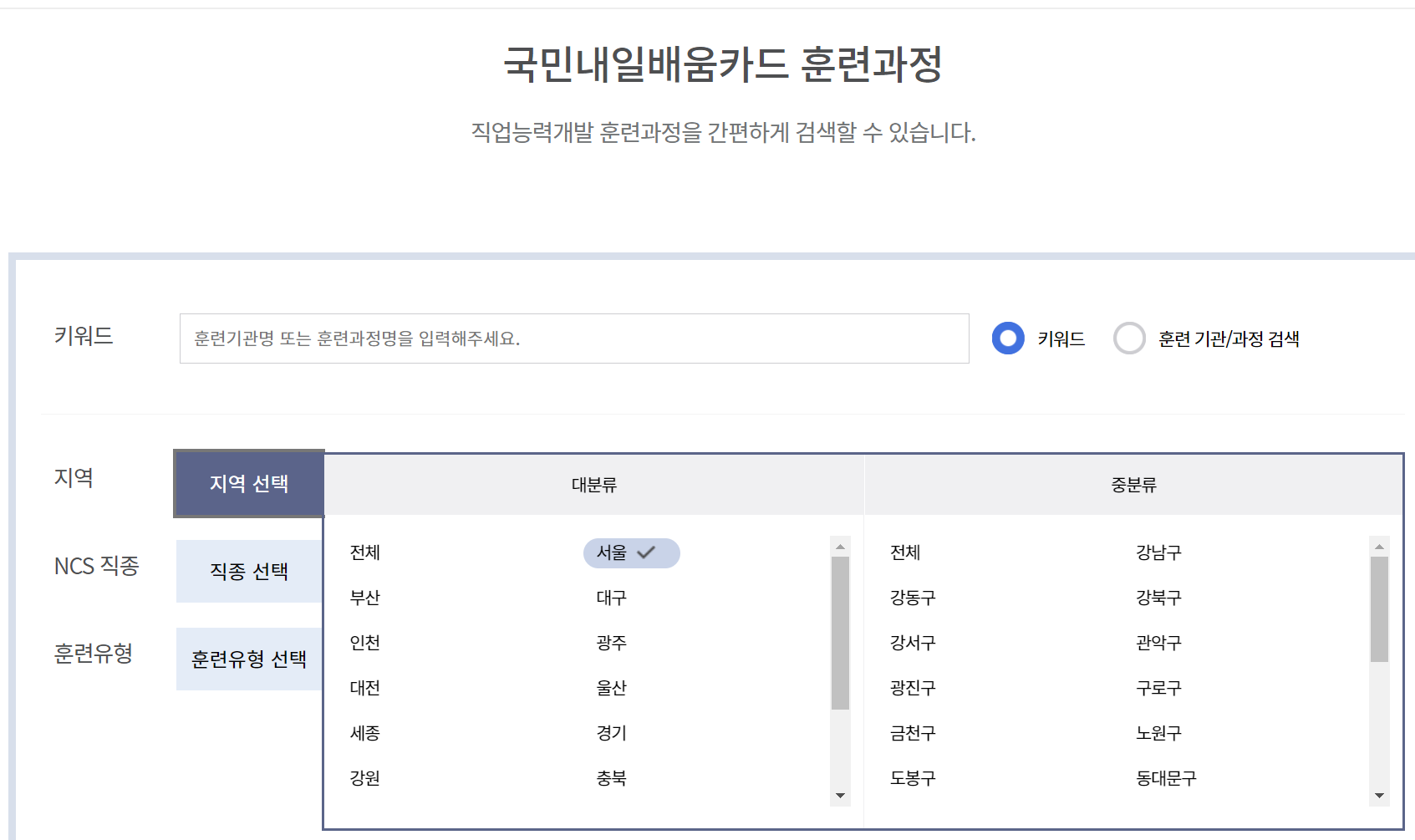 그럼 아래와 같이 "국민내일배움카드 훈련과정"이 뜹니다. 여기서 현재 사는 지역을 선택 하시고 직종, 훈련 유형 등을 선택해 줍니다.