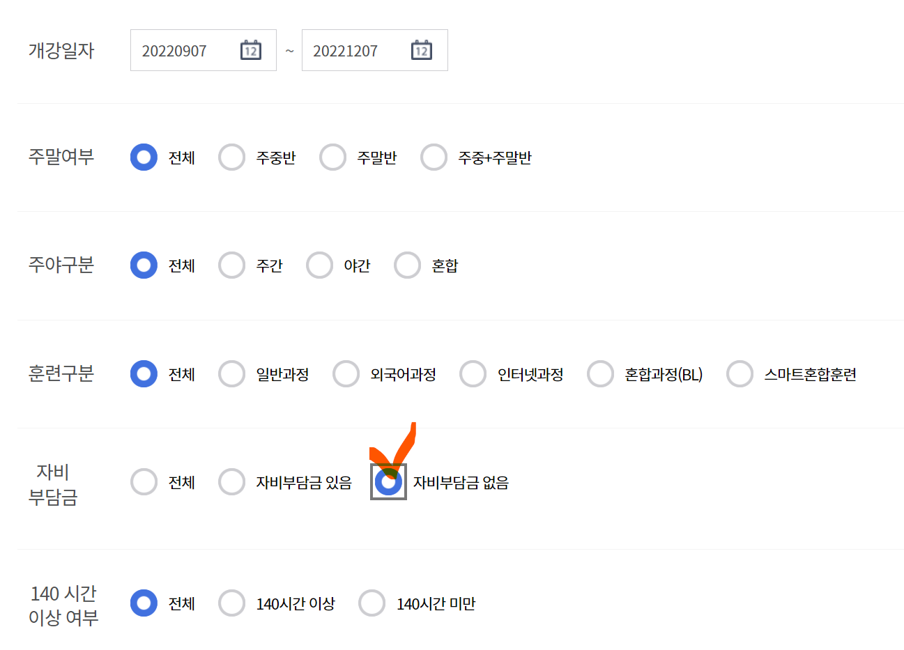 스크롤을 밑으로 내리면 개강일자, 주말여부, 주야구분, 훈련구분, 자비 부담금 등의 메뉴가 있는데 자신에게 맞는 것을 선택 하신 후 자비 부담금에서 꼭 "자비부담금 없음"을 선택해 주셔야 자비 부담 없는 국비지원 무료교육을 확인 할 수 있습니다.