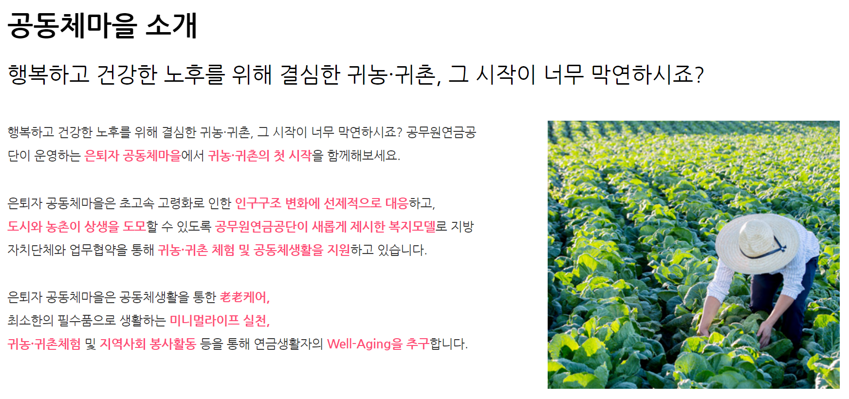 은퇴자 공동체마을 홈페이지에서는 귀농, 귀촌에 대한 정보를 얻을 수 있습니다.