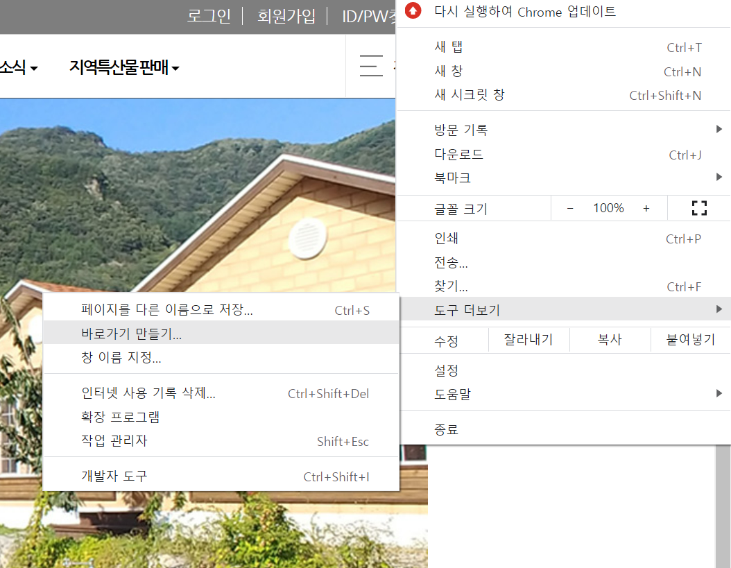 3. 점 세개를 클릭해주면 아래와 같이 "도구 더보기"가 나옵니다. 여기서 "바로가기 만들기"를 클릭해 줍니다.