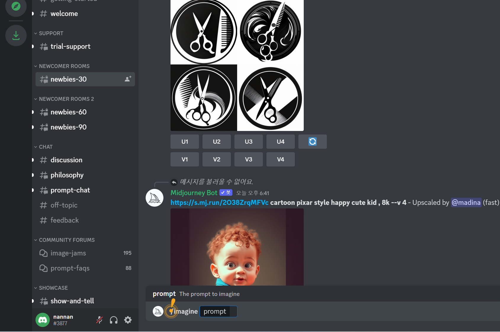 가입을 하면 아래와 같이 메뉴가 뜹니다. 메뉴에 있는 newcomer rooms 를 클릭하고 아래 입력창에서 /imagine 을 입력하면 자동적으로 옆에 prompt가 입력 됩니다.