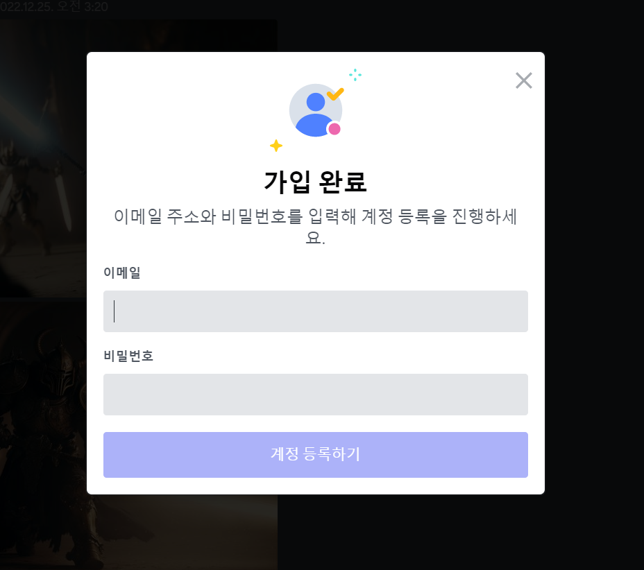 여기서 마지막으로 로그인에 쓸 이메일과 비밀번호를 입력해주면 가입이 완료 됩니다.