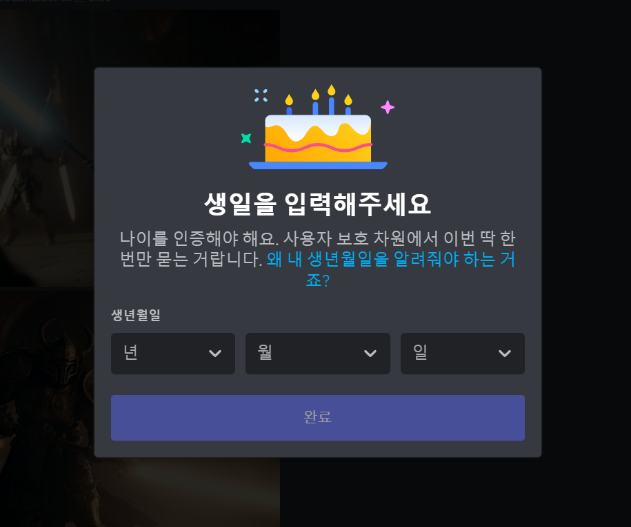 그림 블럭들을 체크하면 아래와 같이 생일을 입력해주세요 창이 뜹니다. 여기서 생일을 입력하고 완료를 눌러줍니다.