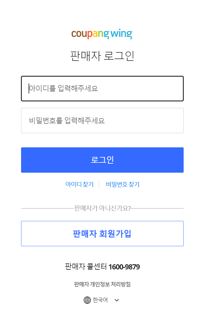 아래 링크를 통해 쿠팡 판매자센터 로그인 쿠팡윙에 접속하여 관리자 페이지에 접속할 수 있습니다.