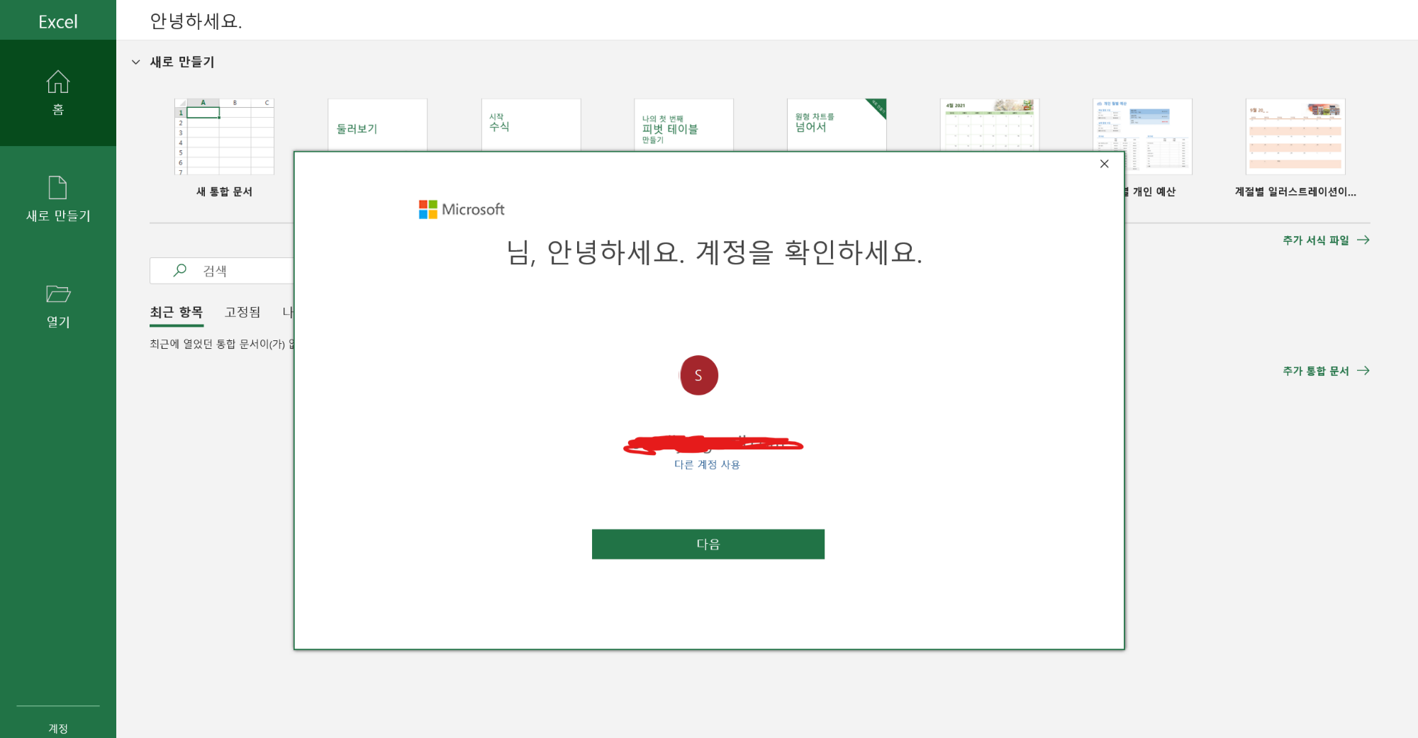 이때 저는 엑셀에 들어가보려고 엑셀을 눌렀는데 계정을 확인하라는 메세지가 뜹니다. 그럼 여기서 다른 계정 사용을 누르고 업체에서 메일로 보내준 아이디와 비번을 누르고 로그인을 해줍니다. (그래야 오피스 365 사용을 할 수 있습니다. 원래 자신의 마이크로소프트 계정으로 로그인을 하면 사용을 할 수 없습니다.)