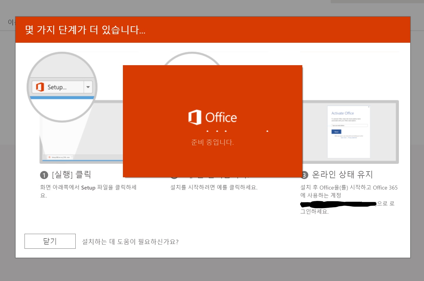 그리고 오피스 다운로드를 눌러 오피스 365 다운로드 버튼을 눌러주면 아래왕같이 오피스 설치 준비중입니다라는 창이 뜹니다.