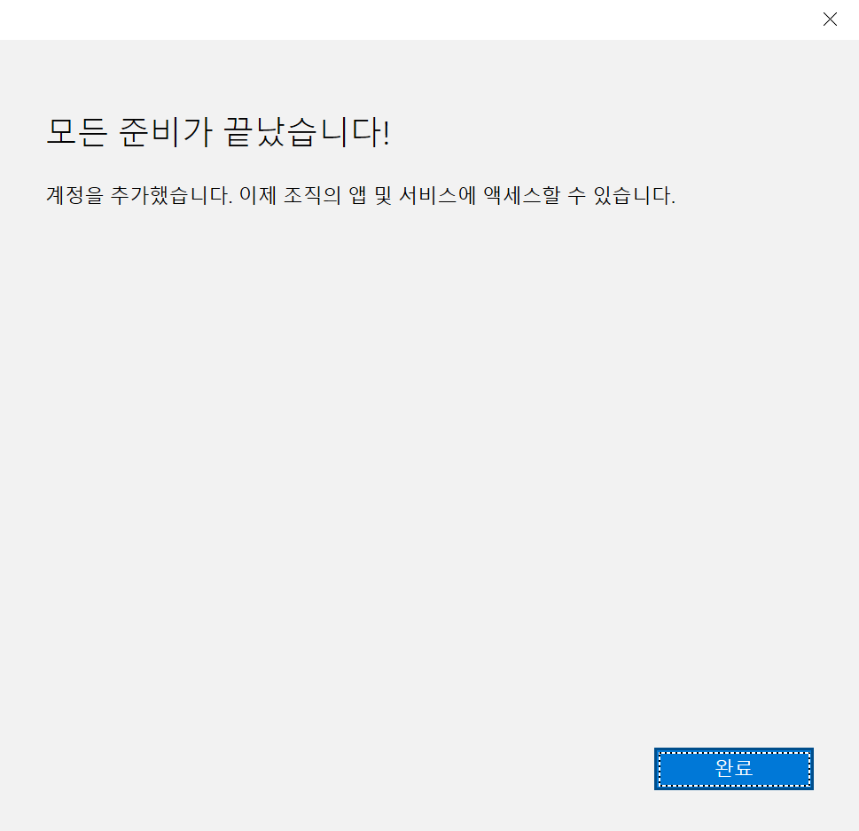 로그인을 하면 모든 준비가 끝났습니다 창이 뜨면서 오피스 365에 발급받은 계정을 추가했다고 합니다. 이제 완료 버튼을 눌러주면 됩니다.