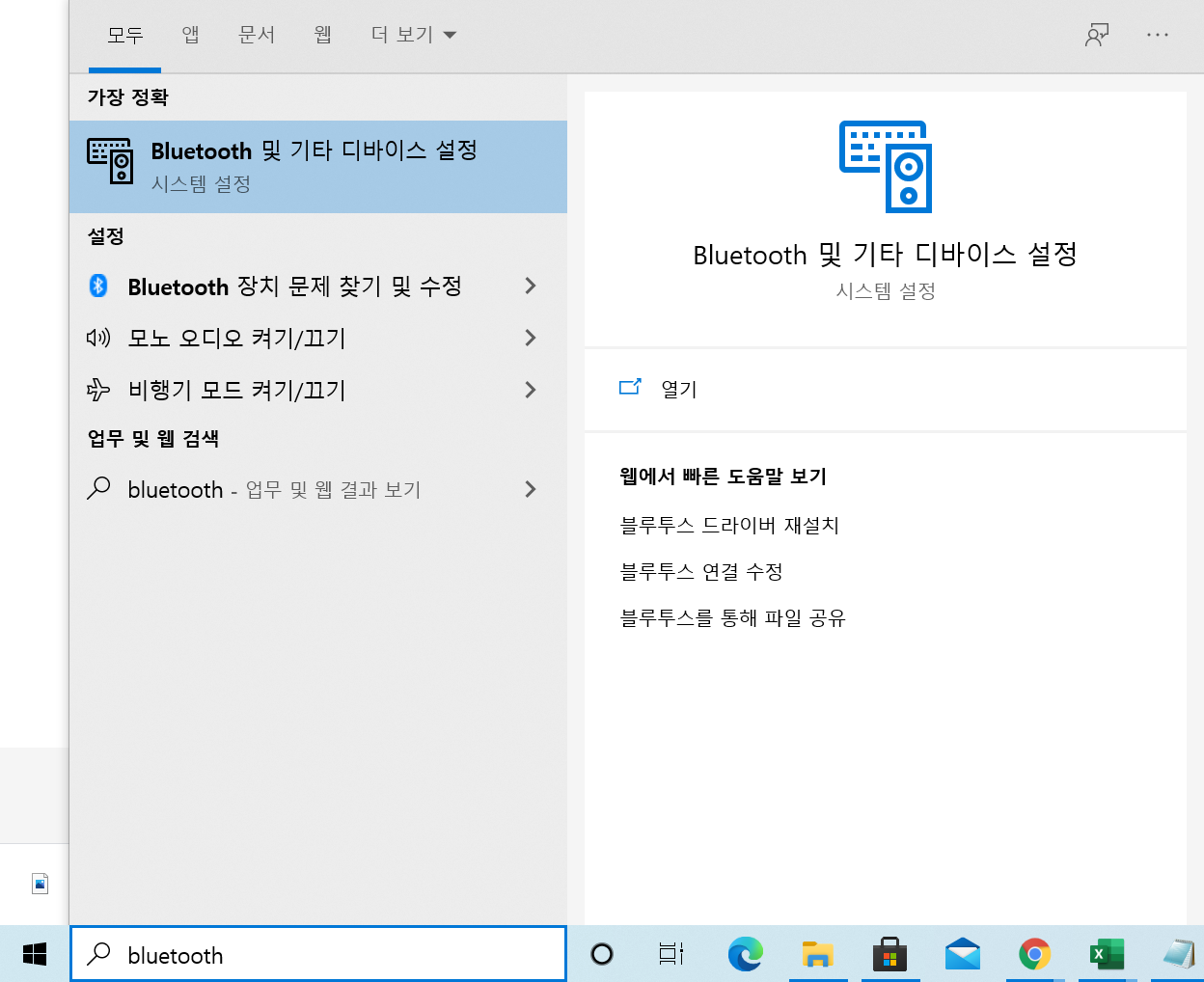 먼저 노트북을 켜고 시작 버튼 옆의 검색 창에 bluetooth 를 칩니다. 그럼 위에 bluetooth 및 기타 디바이스 설정이 뜨면 누릅니다.