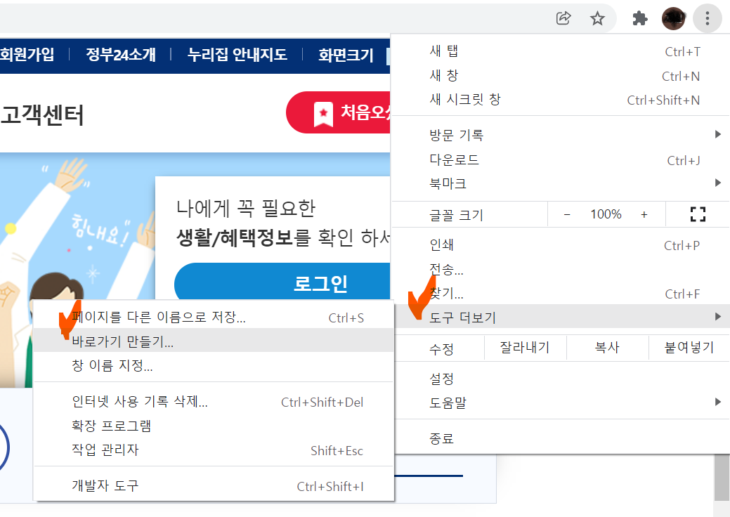 그 후 "도구 더보기"를 클릭한 뒤 "바로가기 만들기"를 클릭합니다.