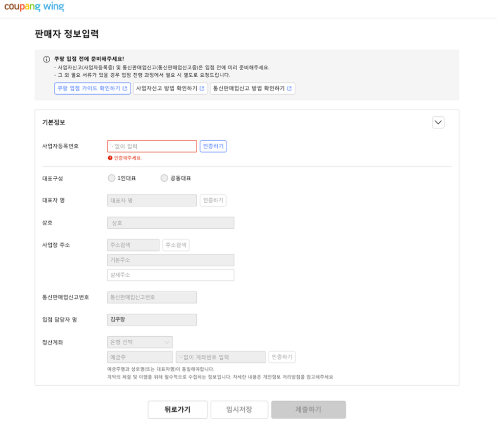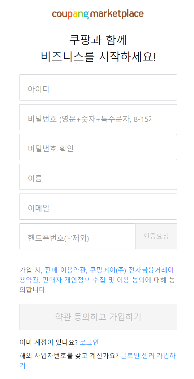 판매자 가입하기를 누르면 회원가입을 하는 페이지가 뜹니다.