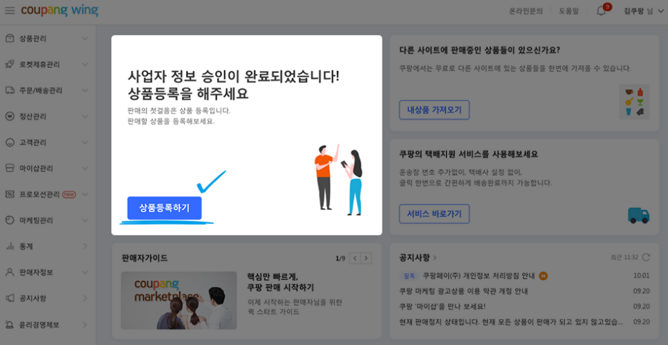 사업자인증을 완료 하면 입점 승인이 됩니다. 입점 승인이 되면 쿠팡 상품 판매가 가능하며 내가 등록한 상품 판매가 시작 됩니다.